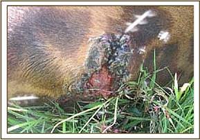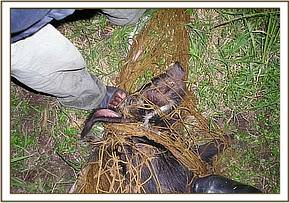 The wire was then retrieved from the wound and removed completely leaving an extensive raw wound on the limb. The wound was also treated using 10% hydrogen peroxide then a tincture of iodine applied topically on it. Anaesthesia was then revived and the animal released back to the wild after being treated successfully.