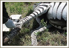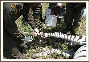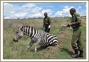 Treatment of an injured common zebra in Game Sanctuary in Naivasha