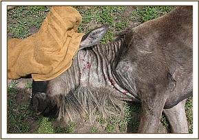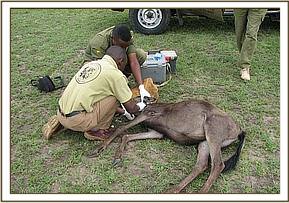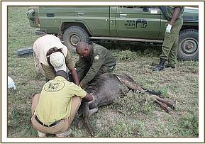 Treatment and samples collection from a wildebeest with mange infestation in Mara Triangle.