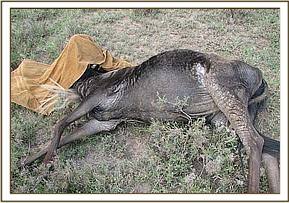 Some of the wildebeests calves in Mara were reported to have mange infestation along Mara river near the Mara Bridge. The disease was suspected to have contributed to deaths of some calves and could be easily transmitted to cheetahs which feed on those wildebeest calves. The veterinary unit in Mara intervened and managed to get at least one wildebeest calf with heavy infestation on the neck and head region.