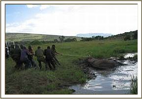 The fracture could not be corrected because of the heavy weight of the elephant, it was under intense pain and had very little chance of survival, it was also becoming an easy target for poachers while it remained lying motionless in the pool, so the decision was made to euthanize it humanely and recover the tusks. The carcass was then pulled and taken far away from the water place, the tusks were removed and kept safely by the management of Mara game reserve awaiting submission to KWS stores.