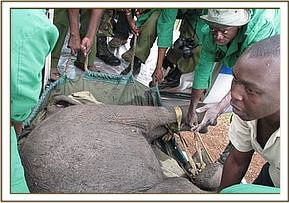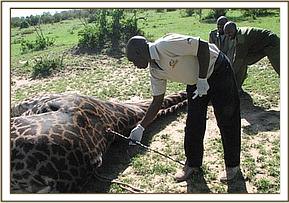 Chemical immobilization and restrain The giraffe was darted from a vehicle using 15mgs of etorphine hydrochloride combined with 50mgs of Xylazine hydrochloride. It took about 5 minutes to get narcotized and was then roped down manually. The spear was pulled out from the abdomen, the spear was smooth and slendor with no hook therefore it did not cause extensive injuries to the abdomen. The wound was drained, cleaned and treated with long-acting antibiotics, the giraffe was still strong and in a very good body condition. Blood samples were obtained from the jugular vein that will be analyzed for health monitoring purposes.