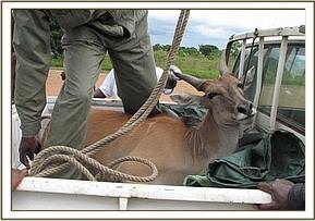 Relocation of an eland from Ngerende Camp to Majimoto area The veterinary unit in Masai Mara received a report of an orphaned sub-adult male eland that had been recovered from the field and reared at Ngerende Camp in Mara. The eland had grown to become adult and was very much habituated and used to human-beings. It had started developing aggressive behaviors and was attacking visitors and staff at the camp. The management of the camp requested for the relocation of the eland to another place within Mara but away from the camp. The eland was then anaesthetized using 5mgs of etorphine Hcl combined with 20mgs of xylazine, it was then loaded to a pick-up vehicle and transported to Majimoto area about 30kms away from Ngerended. It was released near an existing herd of other elands and expected to join and cope up with other elands in the wild.