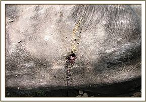 Since this buffalo was weak and trapped it was not necessary to immobilize it chemically. Instead treatments were instituted insitu. All wounds were lavaged with copious amount of water and iodine used to disinfect, green clay was applied and 6000mg Amoxycillin antibiotic given i.m.
