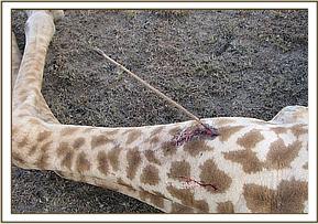 Immobilization was achieved by administration of 13mg Etorphine Hcl and 40mg xylazine Hcl delivered through a 3ml Dan inject dart. It took eight minutes for the drug to take full effect and giraffe assumed a left lateral recumbency position. The arrow was removed; wound was thoroughly washed with copious amount of water, hydrogen peroxide and lugol’s iodine applied. Green clay was then applied.6000mg Amoxycillin antibiotic was administered i.m. In addition 20mg Dexamethasone sodium anti-inflammatory was administered i.m.