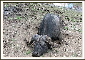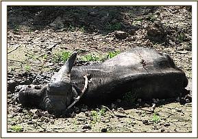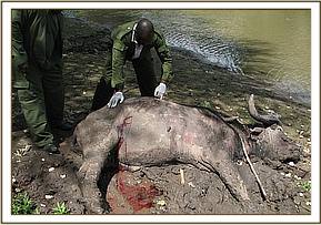 The buffalo appeared weak, left horn and both front limbs were wholly trapped in mud. The hind limbs were partially trapped. He had an old spear wound which was discharging ingesta on his left flank. Fresh cut wounds were visible on the right thigh.