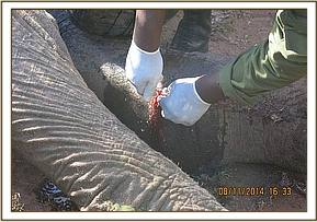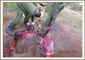 On opening the carcass, the internal organs appeared normal save for excessively darkened blood. The muscles around where the arrow had lodged were dark and appeared gangrenous. This was a case of systemic poisoning. The arrow had been laced with poison and this caused death of this young elephant bull. Because of the small size of tusks, the intention appeared to be just to kill and not to poach so could well be a conflict case.