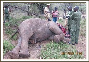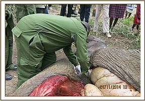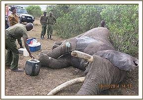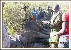 A dead elephant was reported to the Vet Unit by the KWS security team at Oloolaimutia and the team responded to conduct a postmortem and determine cause of death.
