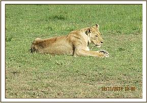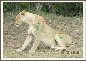 This injured lioness was seen and reported to us by the Mara triangle management. It was thought that the lioness had possibly picked a fight with other lions possibly from a different pride. This lioness was in the company of another female with tiny cubs and was relaxing at the edge of a thicket. Obvious wounds were seen on the left side of her face and left flank. She made a slight move when she saw us but with difficulty as she appeared to be limping on her left hind quarter.