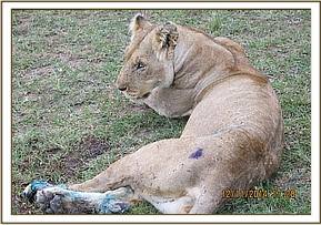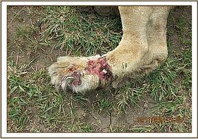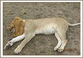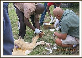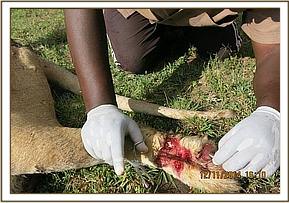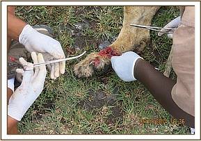 Immobilization was achieved chemically by use of a combination of 4mgs Medetomidine and 260mgs Ketamine in a 3ml Daninject dart from a vehicle. Bibi struggled to take a few steps before giving in to the effects of anesthetics after eight minutes. Examination revealed a severe wound to the distal part of her left foot with a fracture of the distal part of 4th metatarsal bone, bite wounds to her left flank and another wound slightly ventral to her left heal. All the wounds appeared to have been caused by a fight with another lion or hyenas and were beginning to become septic.