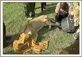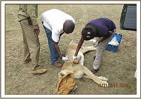 Immobilization was achieved by use of a combination of 4mgs Medetomidine and 250mgs Ketamine delivered through a 3ml Dan inject dart from a vehicle. The lioness moved slightly into the thicket but was overwhelmed by the anesthetics seven minutes after darting. The nursing mother was scared away and the injured lioness taken out of the thicket to be examined and treated in the open. Both eyes were infused with Cloxacillin eye ointment before a face towel was put in place.