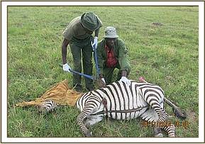 Immobilization was achieved by darting 5mgs Etorphine and 50mgs Azaperone in a 1.5ml Dan inject dart from a vehicle and the zebra succumbed to the drugs after five minutes.