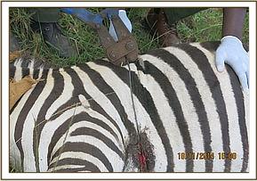This zebra was found restless and in a lot of pain. She could be seen standing for a few minutes, lying down and standing up again. She even made efforts to remove the snare by trying to bite it but unfortunately the snare was deeply embedded into the thoracic muscles.