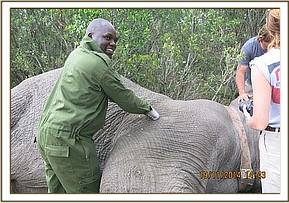 Reversal was achieved by administration of 36mgs Diprenorphine through the ear vein. The elephant woke up in two minutes and dashed back to the thicket.