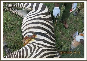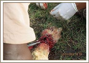 Examination revealed that the two wounds were connected. There were signs of pneumothorax as air breathed in could be heard escaping from the wounds. Both wounds were also heavily infested with maggots. This wound was caused by a spear which entered through the hip area and partly exited through the flank. Because of restlessness and movement through the thickets, this spear could have fallen out. These wounds could have been there for about 10 days.