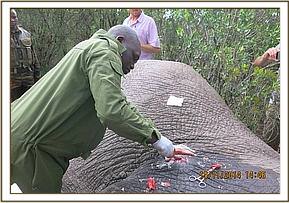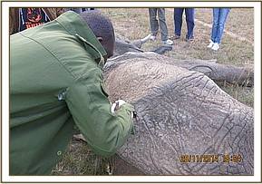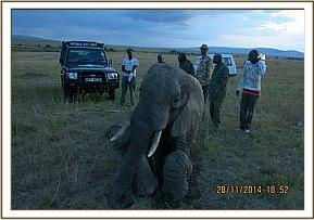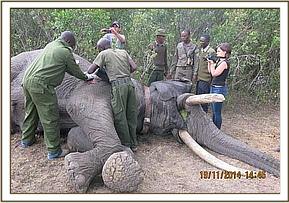 Immobilization was achieved by use of 10mgs Etorphine in a 3ml Dan inject dart from a vehicle. It took eight minutes for the drugs to take full effect with the elephant assuming sterna recumbrency. He was pushed to lie on his left lateral before examination was conducted.