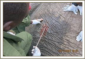 The elephant was immobilized by use of 13mgs Etorphine hydrochloride delivered through a 1.5mls Dan inject dart. Darting from foot was the only feasible option as the elephant was in a thicket. The drugs took effect after eight minutes by which time the elephant had moved to a relatively open area. As it was hot the elephant was doused with a lot of water to keep him cool. Examination of the wound revealed that healing process was going well and the joint capsule was closing, though there was still residual swelling of the joint. The wound was gently cleaned with copious amount of water, wiped dry with gauze swabs before tincture of Iodine was applied. The limb was handled gently to preserve the healing joint capsule and by extension the joint. Cloxacillin ointment was infused into the wound before it was packed with green clay. In addition 1500mgs Clindamycin and 15000mgs of Amoxicillin antibiotics were administered intramuscularly. To relieve pain and reduce swelling 120mgs Dexamethasone sodium anti-inflammatory was also given intramuscularly.