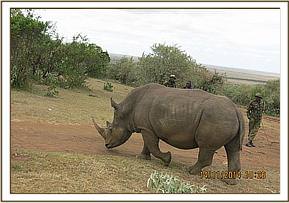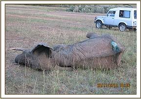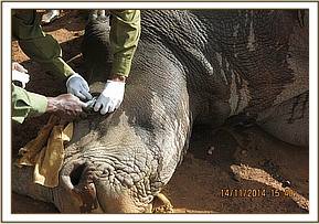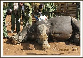 The rhinos were brought back to the boma and the male separated from the female in one of the paddocks. She was immobilized by use of a combination of 4.5mgs Etorphine and 80mgs Azaperone in a 1.5ml Dan inject dart. It took eight minutes for the rhino to be fully anaesthetized assuming right lateral recumbrency.