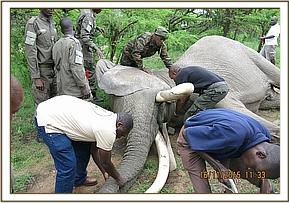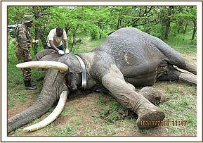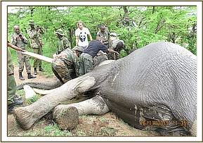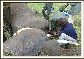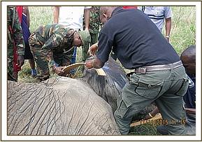 She was immobilized by use of 16mgs Etorphine Hydrochloride. It took eight minutes for the drugs to take full effect with this elephant assuming sternal recumbency. The other family members were scared away by use of vehicles to give room for her to be attended to. She was pushed to lie on her left lateral side before the collar was attached. She was in good condition for her age and state of lactation.