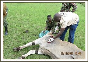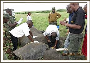 She was given intramuscular injection of 15000mgs amoxicillin antibiotic for prophylaxis and reversed after collar deployment. The whole exercise took twenty minutes. Samples collected from this elephant include tissue for DNA and whole blood for haematology.
