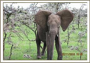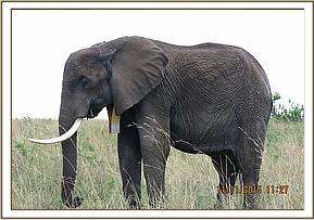 This female with one tusk was spotted near Sand River close to Mara-Serengeti border. She was in a herd of about 13 elephants with a number of calves. She too had a four year old calf and was the matriarch. She was a female of approximately 30years and still lactating.