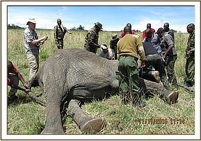 She was chemically restrained by use of 15mgs Etorphine delivered in a 1.5ml Dan-inject dart using the Dan inject darting system from a vehicle. It took eight minutes for the drugs to take full effect with the elephant going down on her right lateral side. The rest of the family members were scared away by use of vehicles to give room for this elephant to be attended to.