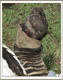 The zebra was in good body condition grazing with other zebras in an open field. He appeared to limp slightly on this limb. A decision to immediately immobilize him and remove the tin was made.