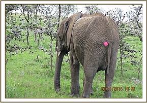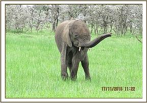 This elephant was found grazing close to a swamp. Her tusks were clearly visible and her age estimated to be over three years. She appeared confident even in our presence and looked like she had lost her mother a while ago.