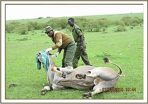 Immobilization was achieved by use of 6mgs Medetomidine hydrochloride and 300mgs Ketamine delivered in a 3ml Dan-inject dart from a vehicle. It took ten minutes for full anaesthesia to be achieved upon which a blindfold was applied.