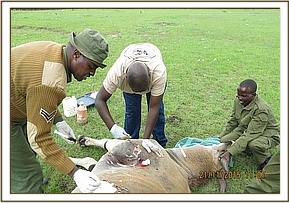 The team agreed that a rescue was not necessary at her age but close monitoring should be provided until she finds a herd to join. It was also decided that once away from the swamp and in the company of a herd, she could be tranquilized and given injectable de-wormers amongst other treatments. Naboisho conservancy rangers monitored her and she was finally treated on 22nd November 2015 with Closamectin broad spectrum anthelmintic, multivitamins and Amoxicillin antibiotics. This was done after being made calm with 80mgs Azaperone delivered through 1.5ml dan-inject dart.