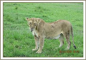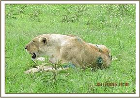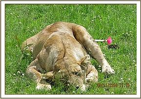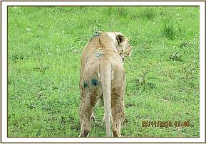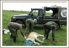 Reversal of the anaesthetic was achieved by intramuscular administration of 17.5mgs Atepamezole hydrochloride one hour after immobilization. She rose up in ten minutes and walked away to join other members of the pride.