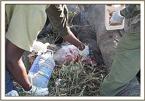 After treatment, the elephant was revived from anaesthesia using 24mgs of diprenorphine hydrochloride administered through the superficial ear-vein. It was to be monitored closely by the Mara rangers who would report its progress regularly to the vet for further treatments.