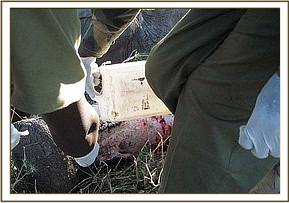 The buffalo had become so aggressive following the attack and just when the vehicle was approaching it for darting it charged at the vehicle and knocked the vehicle several times by its horns. Finally it was captured by darting using 5mgs of etorphine hydrochloride combined with 30mgs of xylazine chloride, it took about 7 minutes for the drug to take effect and the animal became recumbent. The spear was quickly pulled out and the wound probed using a long forceps, the extent of injury in the abdomen could not be immediately established but it was so severe and life threatening.