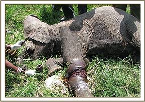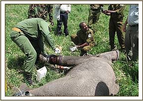 After treatment, it was revived from anaesthesia using 48mgs of diprenorphine hydrochloride administered through the superficial ear-vein. Unfortunately, it was very weak and unable to rise up on its own; it had to be pulled up by ropes tied onto a four wheel-drive-vehicle until it got up. It later rejoined the calf after a few minutes after being revived.