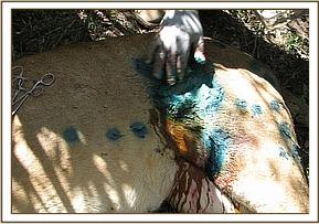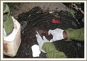 For ease of capture the elephant was pushed to a better terrain before darting. It resisted but finally accepted to move but with difficulty. Immobilization was achieved by use of 15mg etorphine delivered through a 3ml Dan inject dart. Full anaesthesia was achieved after ten minutes with the elephant assuming right lateral recumbency. To access the injury the elephant had to be turned over by use of a vehicle. On closer examination the appeared to have been inflicted by spear and was deep enough to access the peritoneal cavity. There was a purulent discharge. This elephant appeared to have lost body condition with obvious bony prominences. There was also evidence of severe anemia indicated by palour of mucous membranes and collapse of blood vessels. The wounds were duly cleaned with copious amount of water and disinfected with lugol’s iodine. Green clay was then applied before 15000mg Amoxycillin antibiotic given i.m.