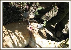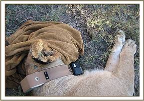 The lioness was lured into the open by playing a call back of a buffalo in distress very early in the morning. The lioness duly responded and joined a pride that had also turned up. She was immobilized by use of 300mg Ketamine and 300mg xylazine in a 3ml Dan inject dart. Additional 100mg Ketamine and 100mg xylazine was given by hand injection after 20mins to achieve sufficient anaesthesia. Deployment of the collar was successfully done in 20mins.