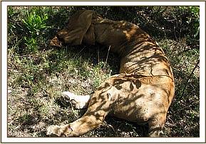 This lioness was reported to have been involved in a fight with other lions resulting in injuries which limited her movements. She kept to herself at the edge of a thicket with a kill said to have been brought by other pride members. By the time of intervention she is said to have been in that location for three days.