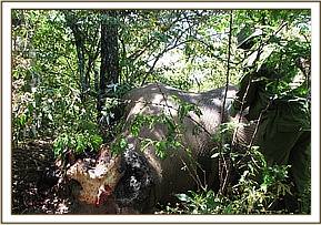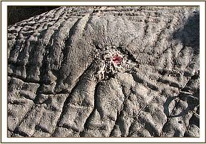 Of significance were the two relatively new wounds on either sides of the flank. They could have been caused by spearing with poison laced spears. Damage to the kidney was fatal. The elephant exhibited hematuria before death.