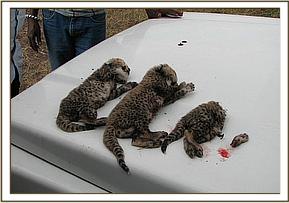 Given their ages it was safe to capture them manually and move them to Nairobi animal orphanage for specialized care. Both cubs were captured and safely transferred to a cushioned transport cage. They were both given 5% dextrose on transit and made calm by covering the cage with blanket to minimize light. This worked and the cubs were calm throughout the journey. Upon reaching the orphanage the cubs were transferred to a bigger cage, given water to drink and fed with rabbit meat. They are currently doing well at the orphanage.