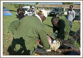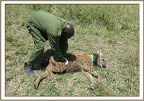 After a spirited search, this hyena was spotted in a hole relaxing, but with a snare obviously visible round his neck. However, he was still active. The hyena was immobilized chemically by use of combination of 4mgs Etorphine and 1mg Medetomidine delivered in a 1.5ml Daninject dart from a vehicle. The hyena had covered a distance of about 300meters before the drugs took effect after approximately four minutes.