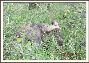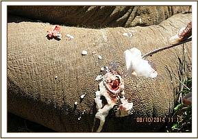 This elephant was immobilized by use of 17mgs Etorphine hydrochloride delivered through a 3ml Daninject dart. Vehicle was used during darting. This elephant moved for ten minutes before giving in to the anesthesia by which time he had covered close to 400metres.He fell on his right lateral exposing the wound on the left limb. This was clearly a fresh spear wound on the lateral surface of the left thigh. The wound was almost 5 inches deep and two inches wide and still bleeding.