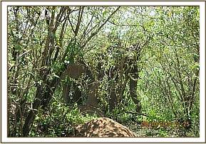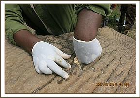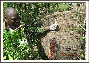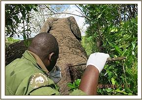 Immobilization was achieved by use of 15mgs Etorphine hydrochloride in a 1.5ml Daninject dart from a vehicle. As soon as he was darted he dashed back to the thicket but remained within sight. The drugs took full effect after eight minutes with the elephant assuming right lateral recumbency. A path was created for the team to access this elephant while the rest of the herd members were scared away by noise and vehicles. The position he adopted was advantageous to the working team because all the wounds were on the left side.