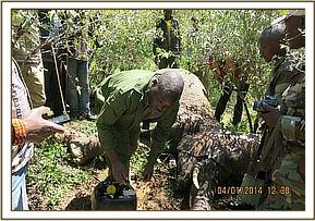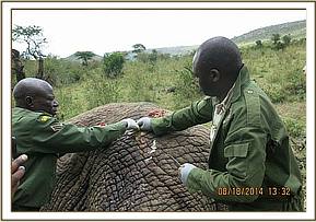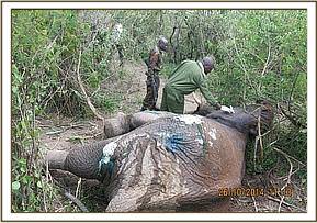 Immobilization was achieved by use of 16mgs Etorphine hydrochloride delivered through a 3ml Daninject dart. The elephant was darted from foot since the terrain was rough and the elephant was in a thicket. As the drugs were taking effect, the elephant was pushed to move to a relatively open area. Full effects of the drugs were achieved after eight minutes with the elephant assuming sterna recumbency.