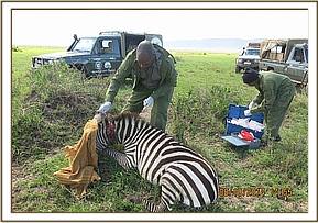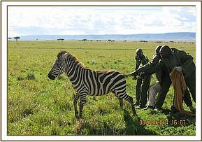 These two zebras, a male and a female, were spotted by Mara triangle rangers with snares around their necks. The female had the snare tightly round the neck almost strangulating her while the male had the snare loosely hanging from his neck. Since both were of same age and size, the dosages used for their immobilizations were similar. Immobilizations and treatments were done in turns.