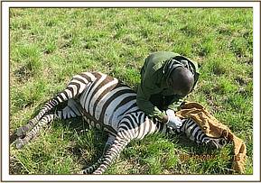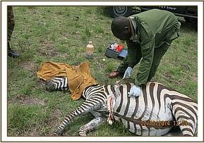 This zebra was immobilized by use of a combination of 5mgs Etorphine hydrochloride and 50mgs Azaperone in a 1.5ml Daninject dart. Darting was carried out using a vehicle. The drugs took effect after 5minutes with the zebra assuming left lateral recumbency.