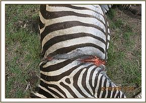 This zebra was spotted and reported to us by Mara Triangle management. She was seen with a tight snare round her girth. The snare had caused deep injuries round her thoracic and shoulder muscles.