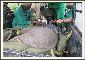 This young bull was immobilized by use of 12mgs Etorphine hydrochloride delivered through a 1.5ml Daninject dart. Because of the thicket, the elephant was darted from foot. The drugs took full effect in eight minutes with the elephant assuming left lateral recumbency position. After making sure the elephant was stable, examination was conducted which revealed an injury on the inner side of his right carpus. However, the whole joint was swollen. The shrubs were cleared from the area and the elephant was flipped over to lie on his right side for better access to the injury.