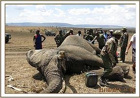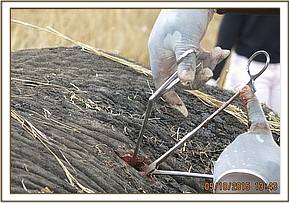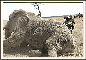 Restraint was achieved by administration of 17mgs Etorphine hydrochloride through a 3ml dan-inject dart from a vehicle. It took nine minutes for the drugs to take full effect with the elephant assuming sternal recumbency. He was pushed over onto his right side.