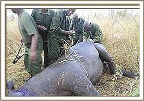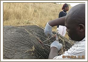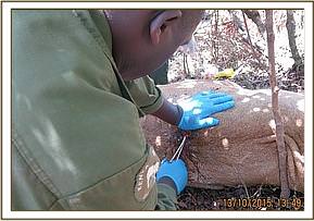 Chemical restraint was achieved by administration of 16mgs Etorphine hydrochloride delivered through a 3ml Dan inject dart from a vehicle. He was prevented from going into a nearby thicket using vehicles and guided towards a more open area. It took eight minutes for the drugs to take full effect with this bull assuming left lateral recumbency. He had to be flipped over using a vehicle and ropes in order to access the injured side.