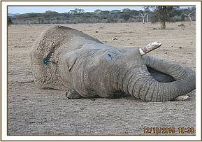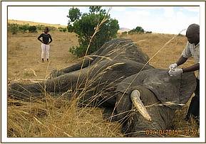 Due to the involvement of the peritoneum and left kidney, prognosis was considered grave and sadly, this massive bull succumbed 24hrs after intervention. There was extensive left kidney damage and peritonitis. Both tusks were recovered and taken by KWS security staff for accounting and safe custody.
